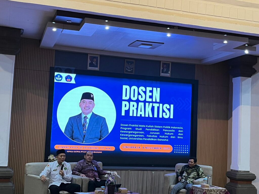 4 November 2025 – Program Studi Pendidikan Pancasila dan Kewarganegaraan (PPKn), Fakultas Hukum dan Ilmu Sosial (FHIS), Universitas Pendidikan Ganesha (Undiksha) menyelenggarakan kegiatan Perkuliahan Bersama Dosen Praktisi yang bertempat di Auditorium Balingkang Confucius Institute Undiksha. Kegiatan ini merupakan wujud nyata implementasi kebijakan Merdeka Belajar–Kampus Berdampak yang menekankan pentingnya kolaborasi antara perguruan tinggi dengan dunia profesional guna memperkaya pengalaman belajar mahasiswa.